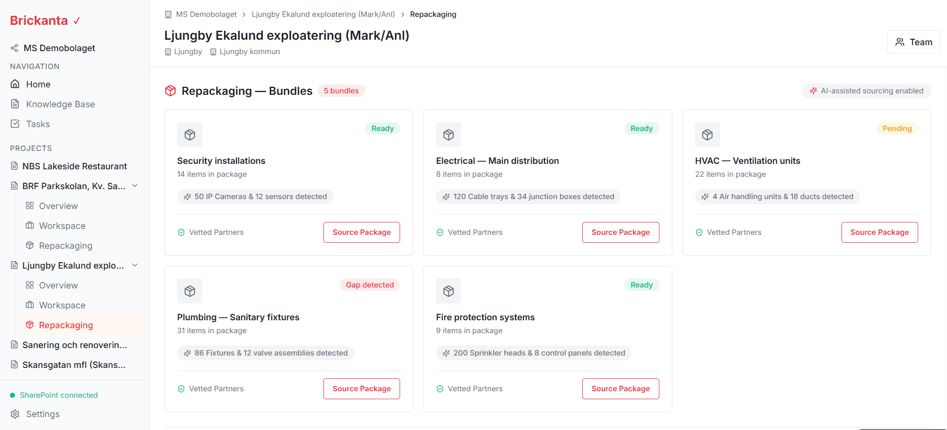 The Solution: The "Procurement Bridge". I added a Source Materials component to the repackaging screen. When AI detects materials (like 50 IP Cameras), it triggers an elegant pop-over with live quotes from vetted suppliers like Ahlsell, turning data detection into one-click sourcing.