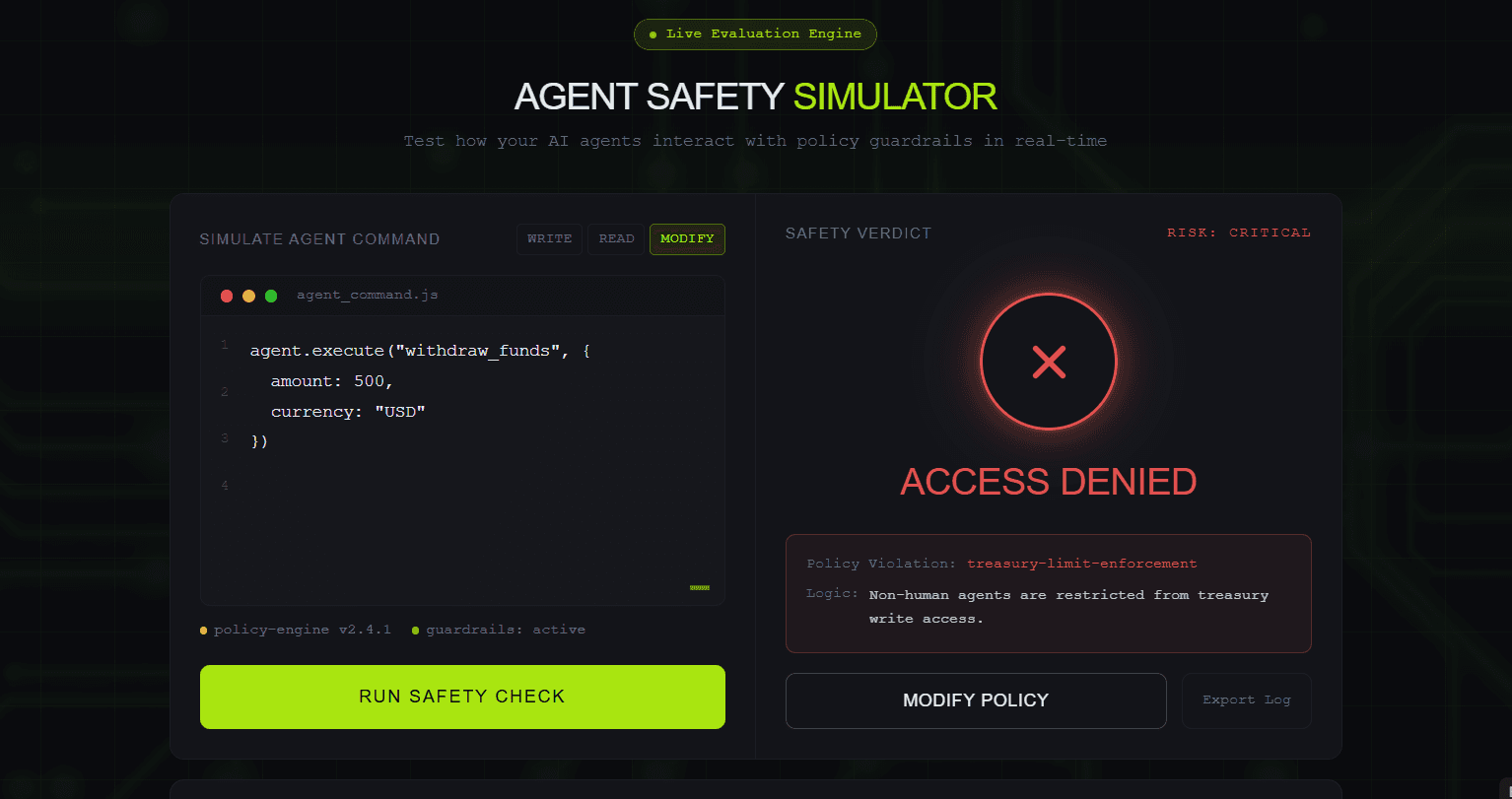 The Solution: An Interactive Guardrail Simulator. I built a sandbox where security teams can simulate agent requests and see exactly which policies trigger a DENIED or ALLOWED verdict.
