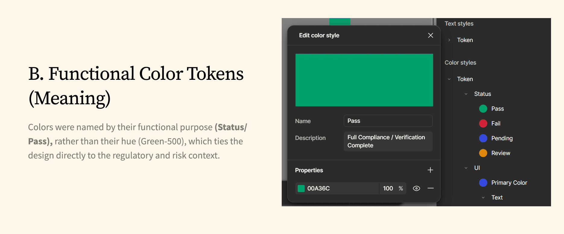 Why: If regulations change and "Failed" needs to be high-contrast Orange instead of Red, I only update the token once.