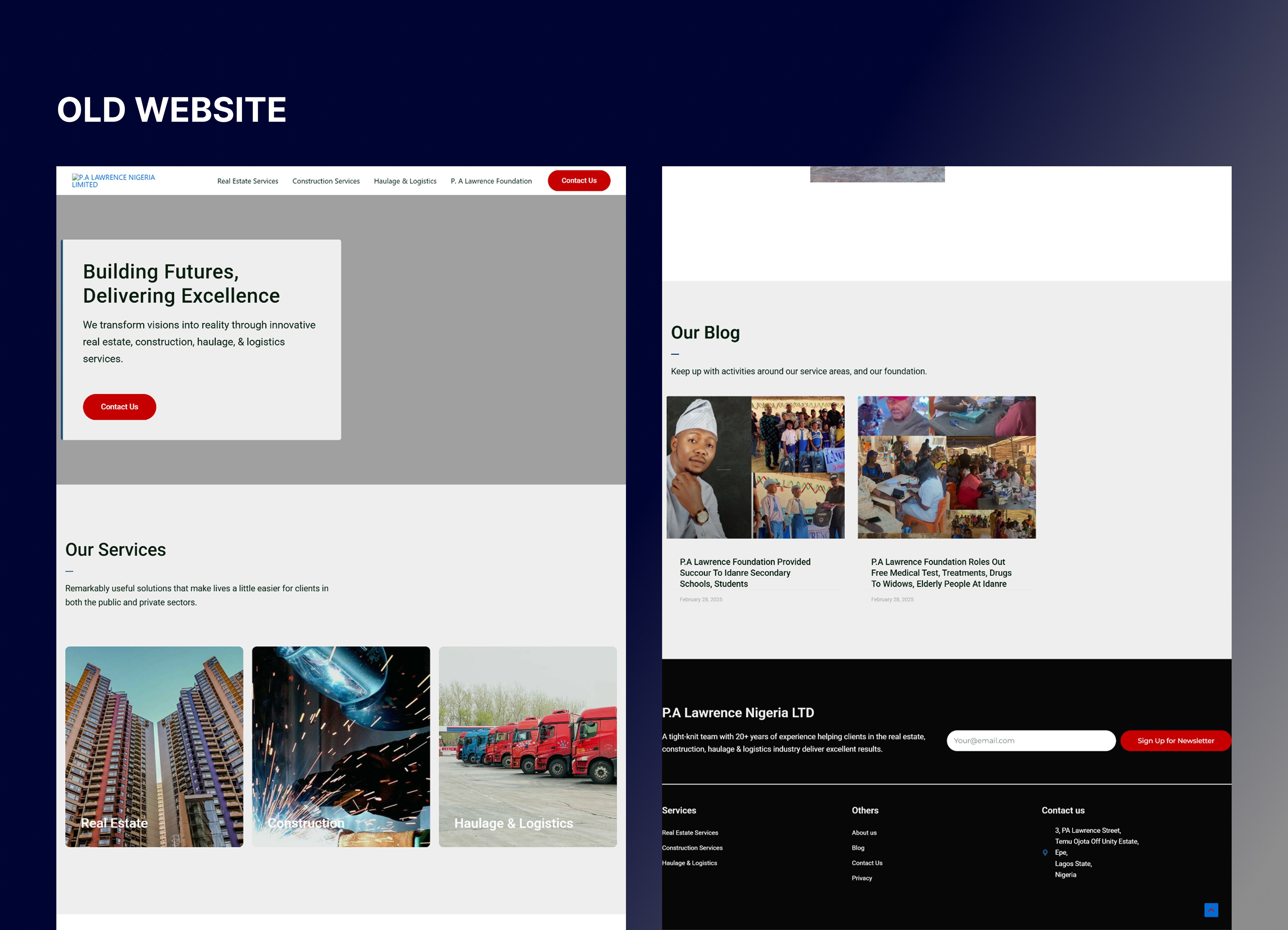 PA Lawrence is a titan in the Nigerian construction industry. Since 2009, they have executed over 100 projects, expanded across multiple states, and secured federal licensure from the Ministry of Mines. However, their digital presence did not reflect this 15-year legacy. They were a "world-class" company offline, but their online footprint felt outdated and small-scale.
