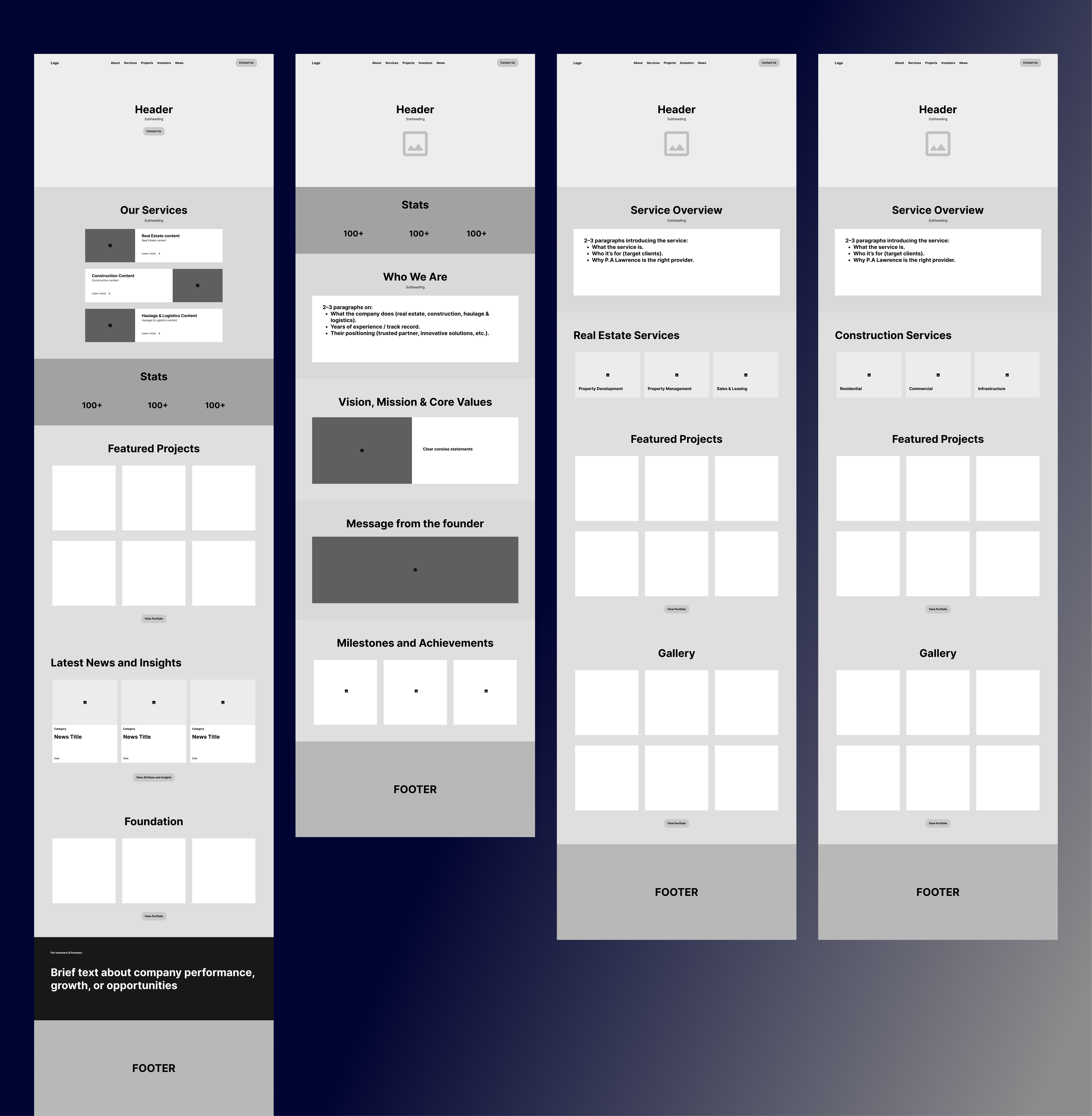Before designing the visuals, I created low-fidelity wireframes to fix the site's structure. My goal here was to map out a user journey that guides clients from the "About Us" section directly to the "Portfolio" in as few clicks as possible.